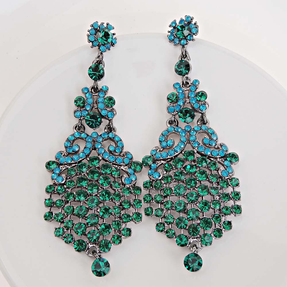Серьги длинные на гвоздиках зелёно-голубые с гальваническим покрытием под чернённое серебро со стразами