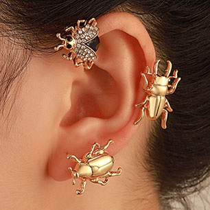 Каффы на уши покупают девушки, стремящиеся выглядеть необычно и креативно. Такие украшения держатся не только на мочке, они обрамляют всю ушную раковину. Верхнее крепление представляет собой зажим, нижнее – обычный «гвоздик». Также существуют варианты с клипсами, для которых прокалывать мочку не понадобится.