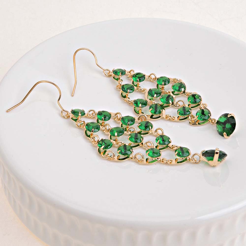 Серьги на крючках зелёные с гальваническим покрытием под золото со стразами
