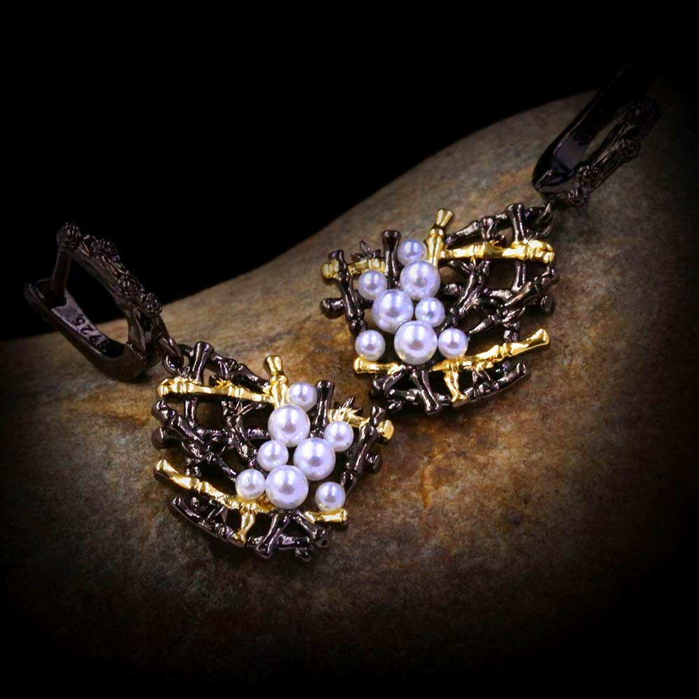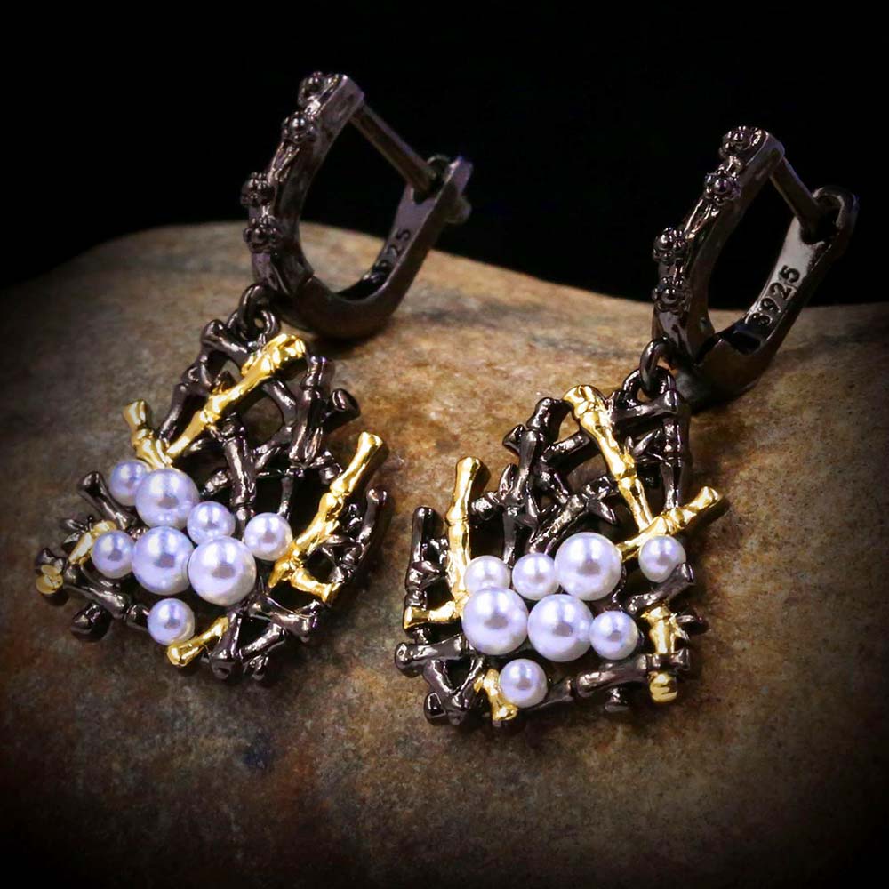 Серьги с английским замком в винтажном стиле с родиевым покрытием с искусственным жемчугом Майорка (покрытие натуральный перла